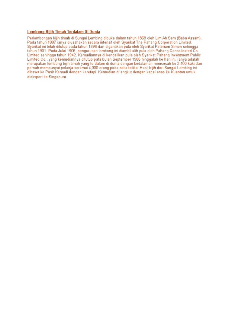 Carian wikipedia dalam bahasa melayu. Kekurangan sumber harga yang tidak stabil kos pengeluaran yang meningkat persaingan dari pengeluar bijih timah lain seperti indonesia, thailand dan bolivia. Perusahaan bijih timah merupakan perusahaan yang tertua dan bahan eksport utama di tanah melayu. Kewujudan kuala lumpur dikatakan bermula di penemuan sungai gombak dan sungai klang. Timah atau timah putih dan stannum dalam bahasa latin ialah sebuah unsur kimia dalam tabel periodik yang mempunyai simbol sn dan nomor atom.